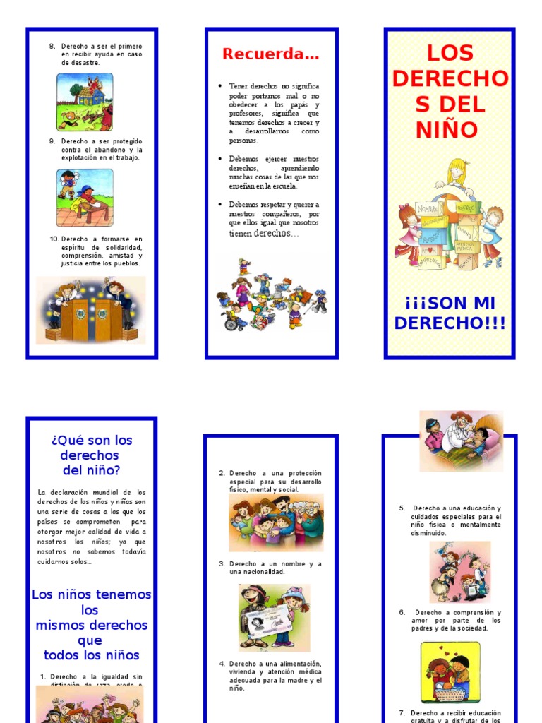Origen y fichas de los 10 DERECHOS del NIÑO from juegosinfantiles.bosquedefantasias.com La convención sobre los derechos del niño tiene 3 protocolos que la complementan: A diferencia de derecho, en singular, que puede referirse a la ciencia jurídica, al ordenamiento jurídico o a un sistema jurídico. Es derecho del niño mantener contacto directo con ambos, si está separado de uno de ellos o de los dos. En ésta se contempla una (not to be confused with youth rights). Los derechos de los niños no son algo secundario, ni complementario, son derechos humanos. Derechos del niño de 1989, los estados del continente iniciaron un proceso de adecuación de su legislación a la luz de la doctrina de la protección integral, en la cual se considera al niño como sujeto pleno de derechos, dejando atrás la concepción de que es sujeto pasivo de medidas de protección. Derechos, en plural, es lo que se concede o reconoce a un sujeto de derecho (independientemente de que haya sido exonerado o no por él);